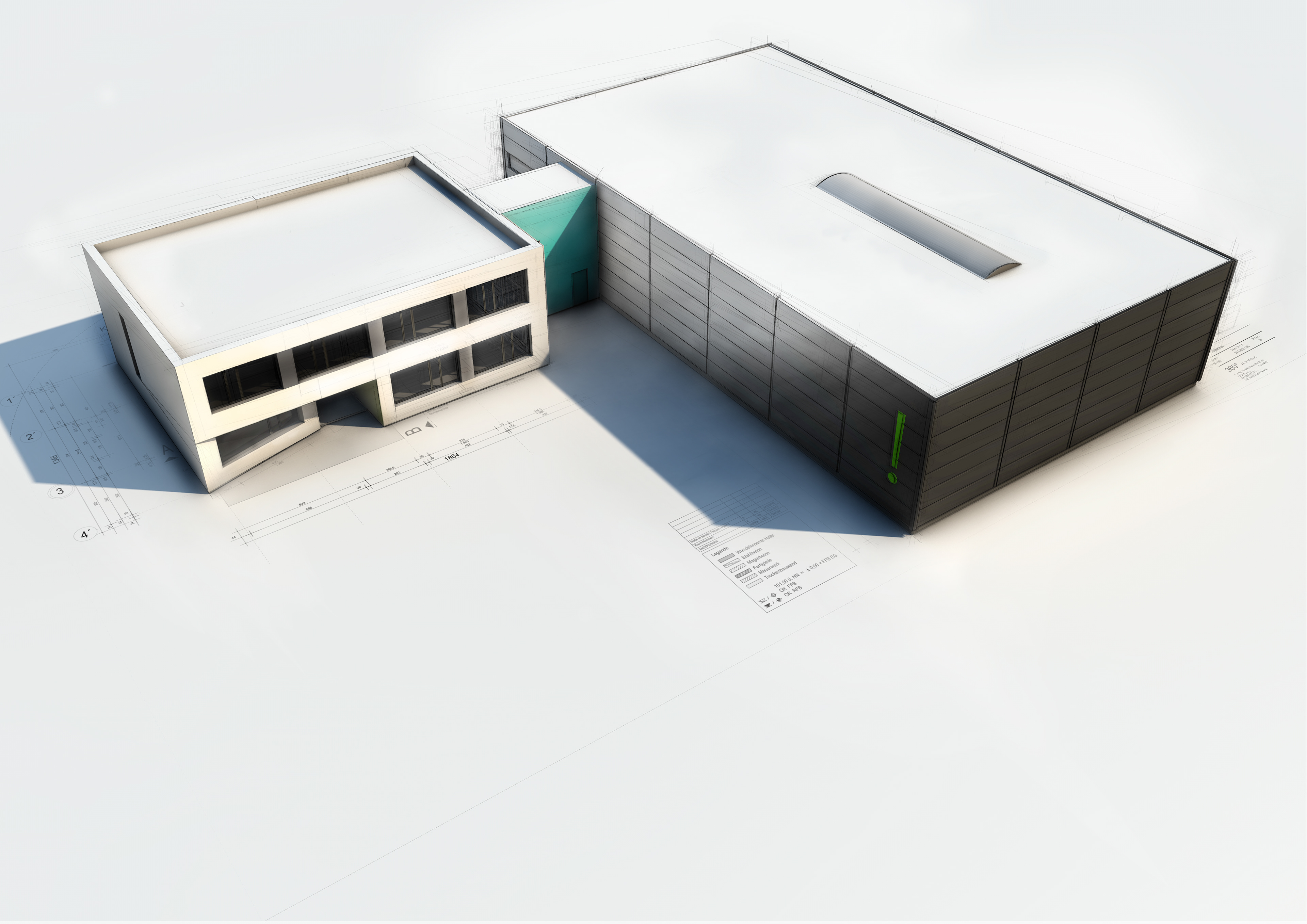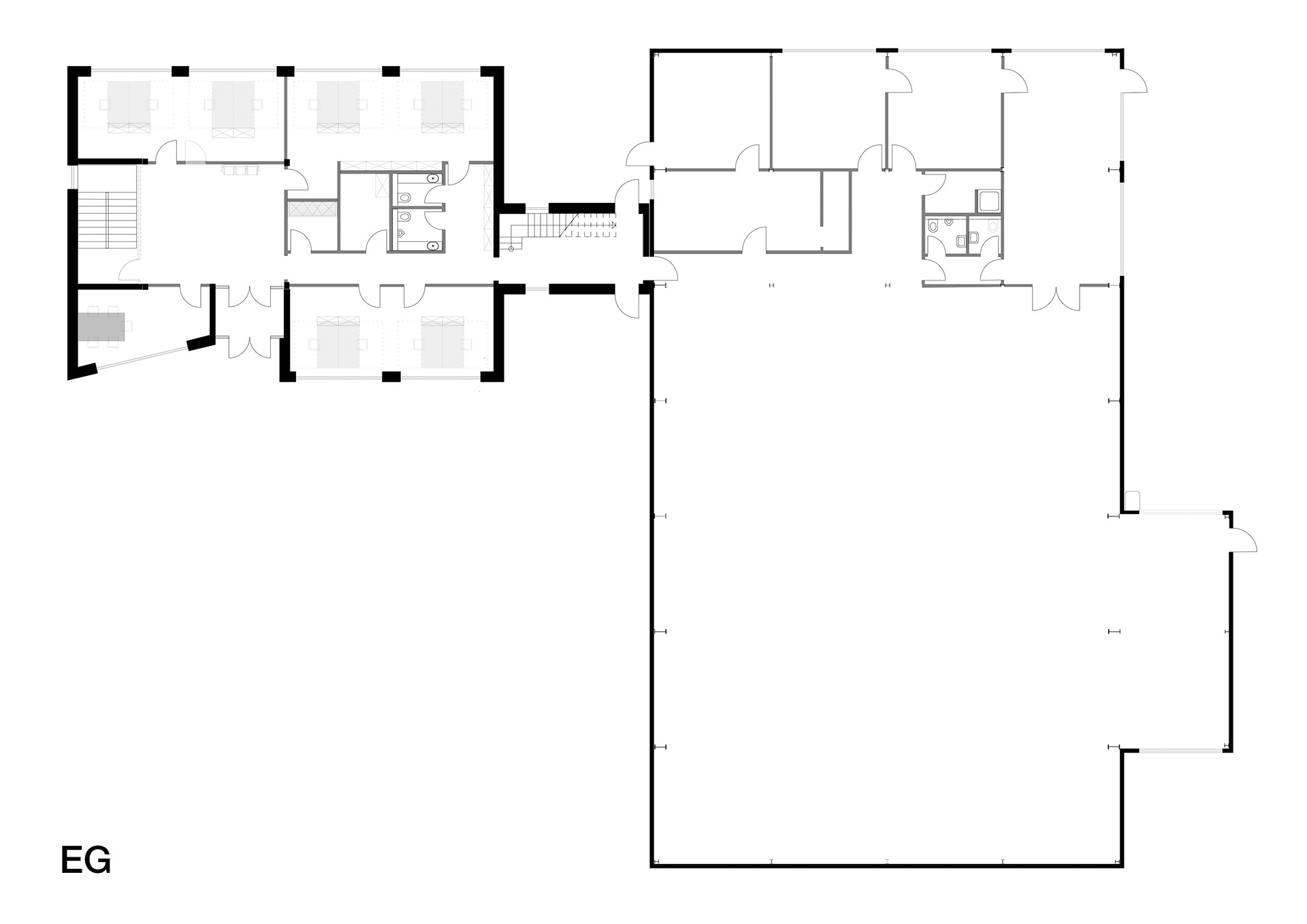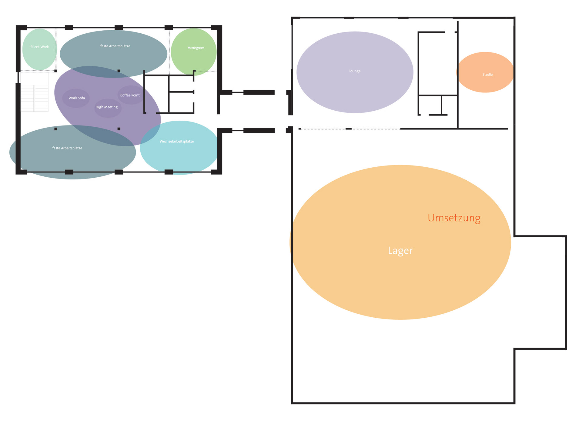 Im EG entstanden drei voneinander autarke Doppelbüros zu Vermietzwecken, sowie ein gemeinschaftlich nutzbarer Meetingraum und eine Teeküche. Im angrezendenen Bereich der Lagerhalle wurden neben Logistikflächen auch Werkstätten und ein Studio für Workshops intergriert. Das OG des Bürotraktes ist als offener und lichtdurchfluteter Raum mit einer definierten Zonierung, die sich an den verschiedenen Arbeitsschritten orientiert, ausgeführt. Im Bereich der Lagerhalle ermöglicht eine partieller Überbau der Fläche mit Stahlbau einen weiteren, über 100 qm großen, Raum auf Büro-Niveau. In dieser gemeinschaftlichen Lounge kocht und isst das Team mittags gemeinsam, aber auch legere Meetings können hier abgehalten werden.