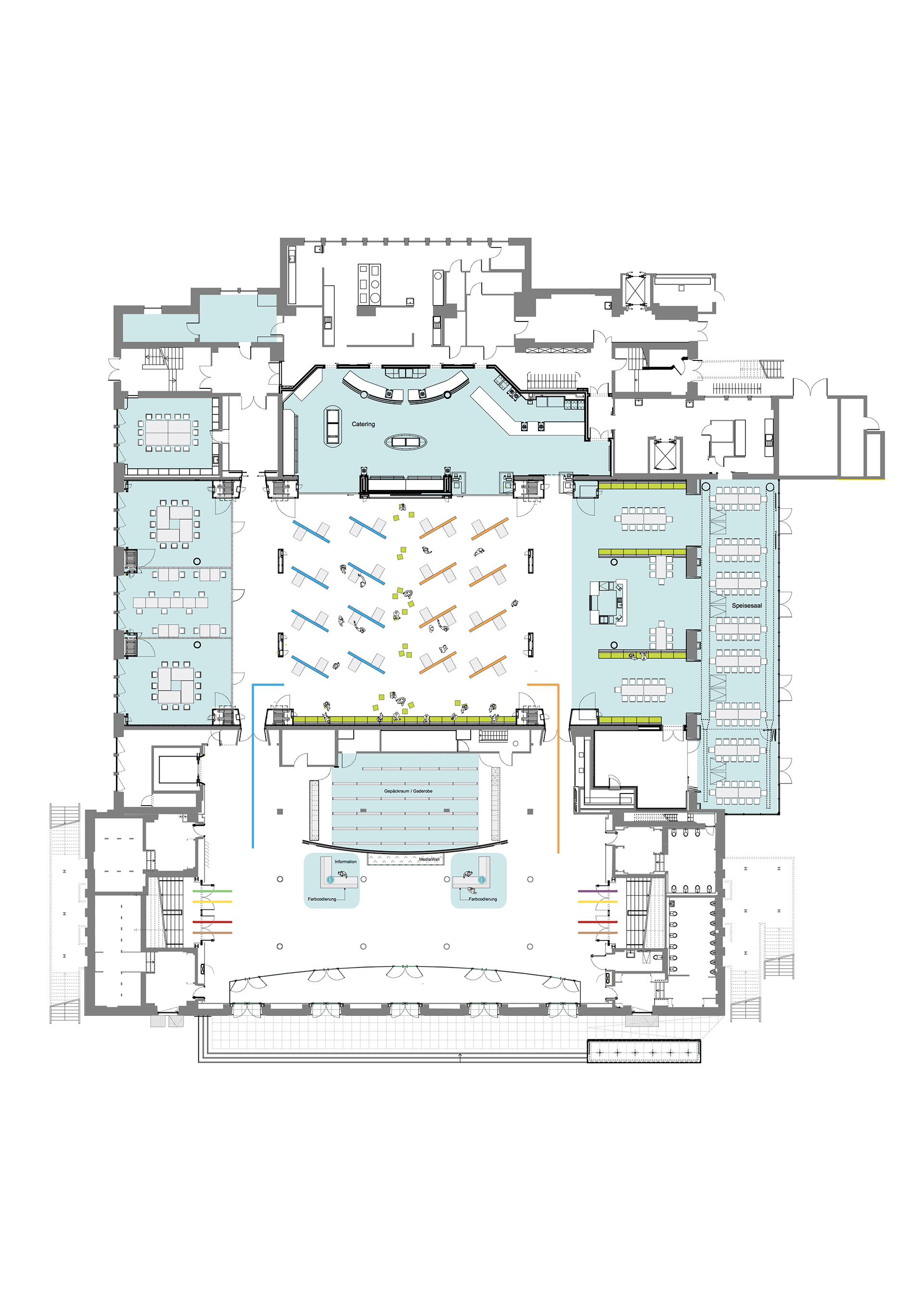 Die entwickelte Geometrie der Doppelstände schafft den Spagat zwischen Raumbild und Anforderungskatalog und die Positionierung der Doppelmodule quer zu den Fenstern lässt eine lichtdurchflutete und klar strukturierte Ausstellung entstehen, in der jeder Jungforscher optimale Bedingungen zur Vorstellung seiner Ergebnisse vorfindet. Um den Konkurrenzdruck unter den Jungforschern nicht weiter zu fördern ermöglicht das Arrangement der Kabinette zueinander den Sichtkontakt und die Kommunikation zwischen den Teams und fördert so deren Netzwerken.