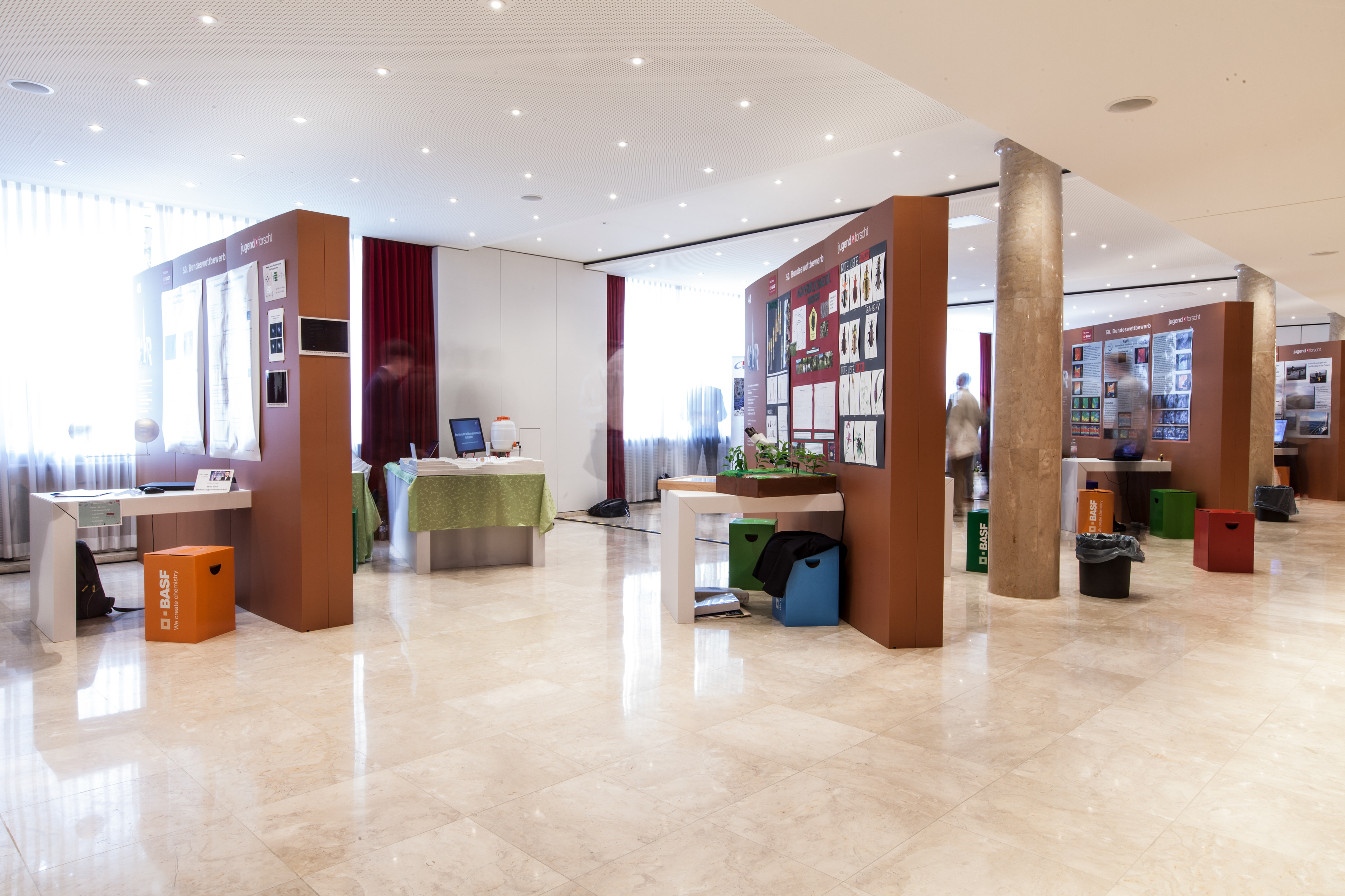 Die besondere Herausforderung in diesem Ausstellungskonzept bestand darin, 120 baugleiche Ausstellungskabinette zu entwickeln, die in adäquater Weise mit der spärlichen Grundfläche des BASF Feierabendhauses auskommen und trotzdem jedem Projektteam die gleichen, durch Jugend forscht definierte, Präsentationsfläche garantieren.