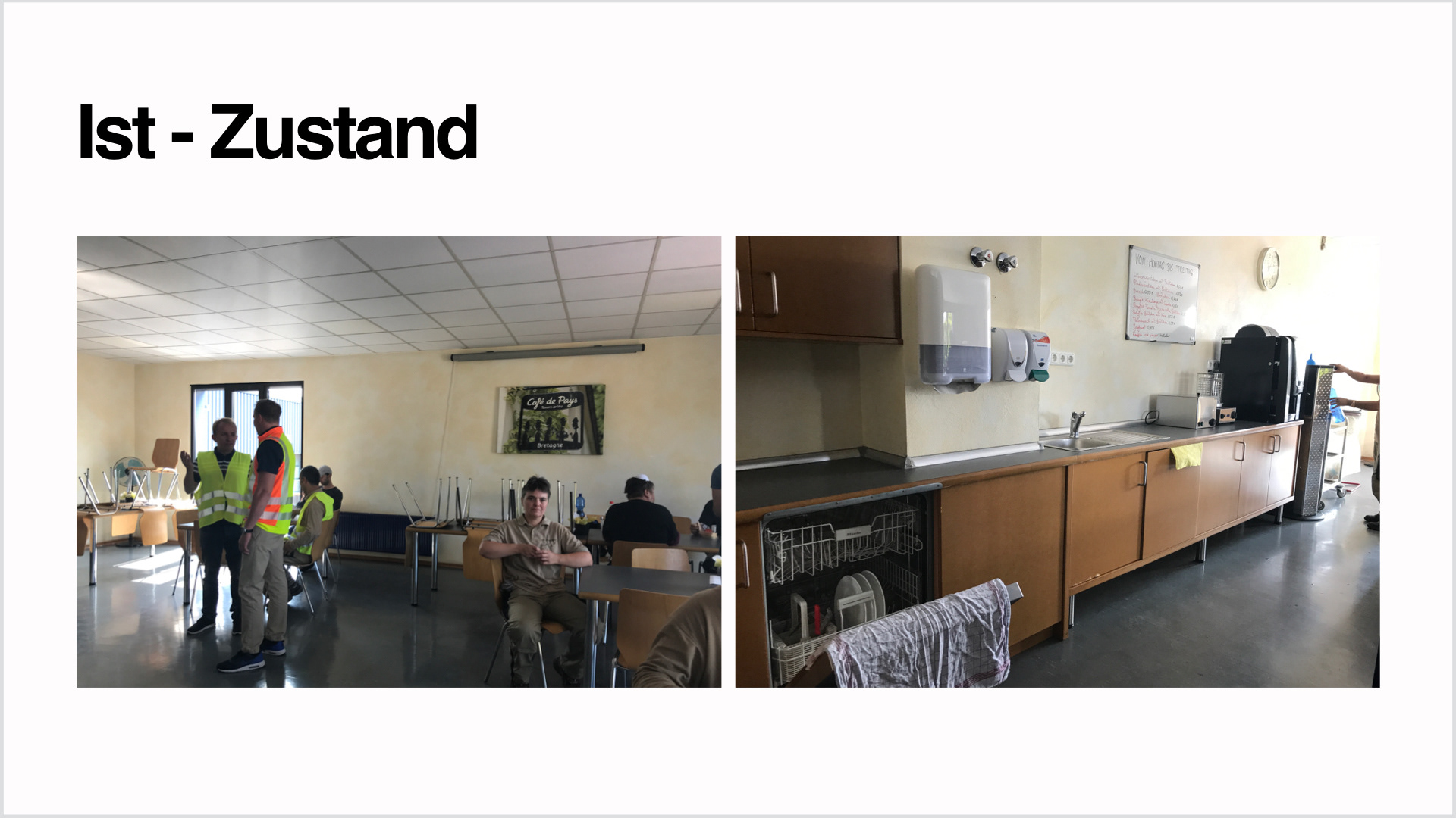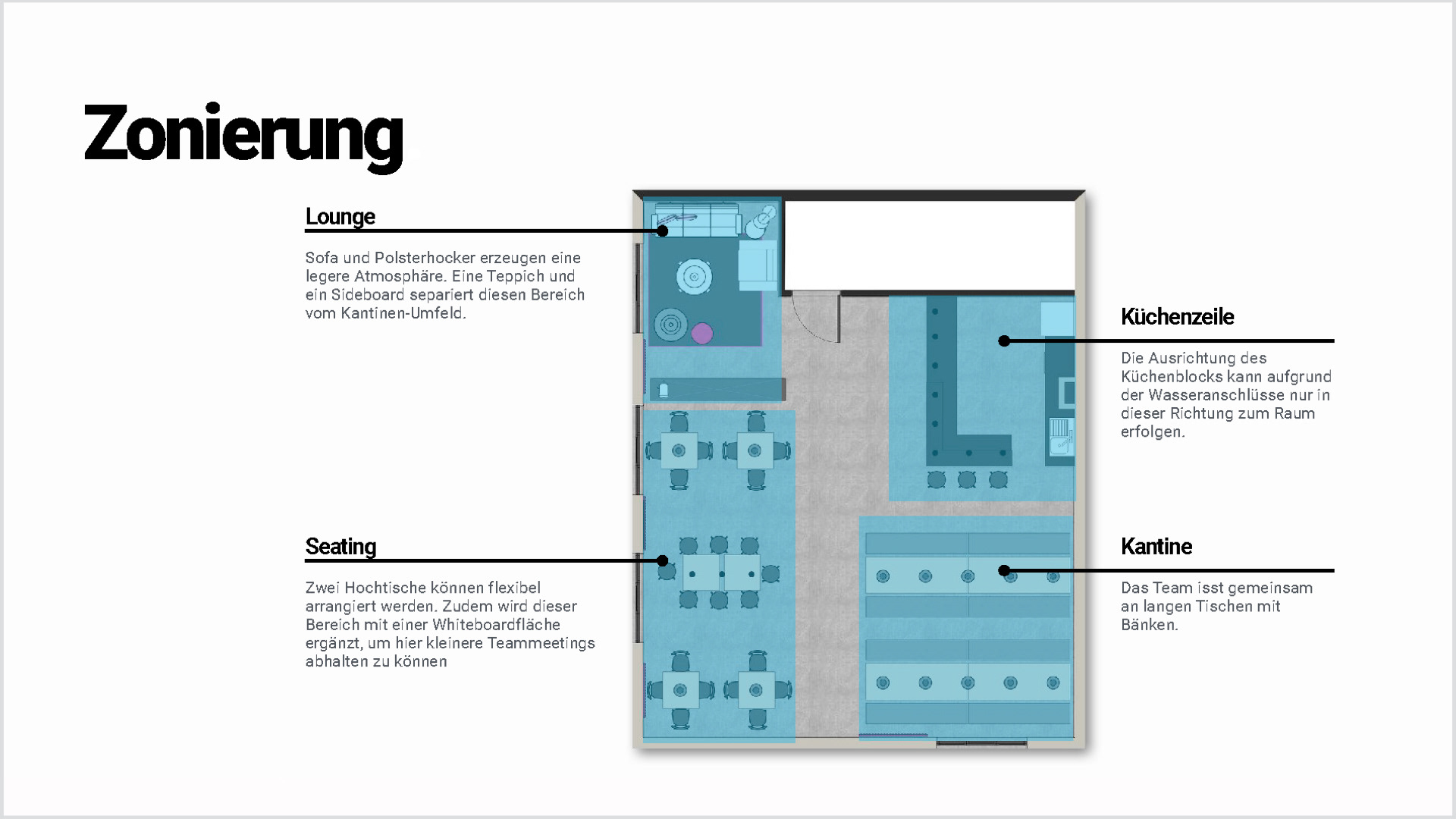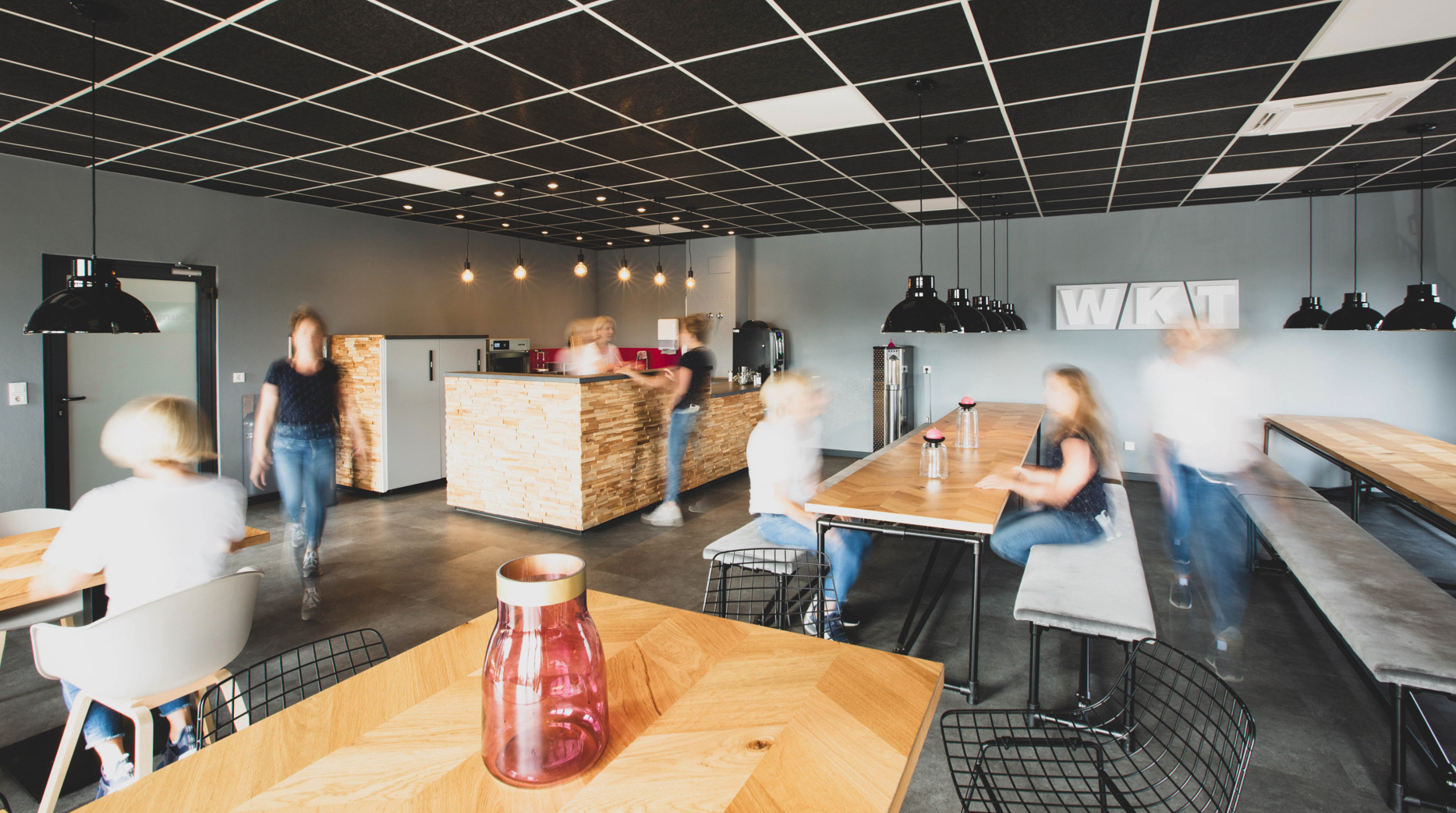 Der in die Jahre gekommene Sozialraum eines Hanauer Industriebetriebes sollte renoviert und ein zeitgemäßes und multifunktionales Interior erhalten. Zukünftig sollten hier kleine Speisen zubereitet, legere Meetings abgehalten, sowie kleine Produktpräsentationen stattfinden können. Um den betrieblichen Ablauf nicht zu stören mussten sämtliche Renovierungs- und Umbauarbeiten innerhalb von vier Werktagen durchgeführt werden.