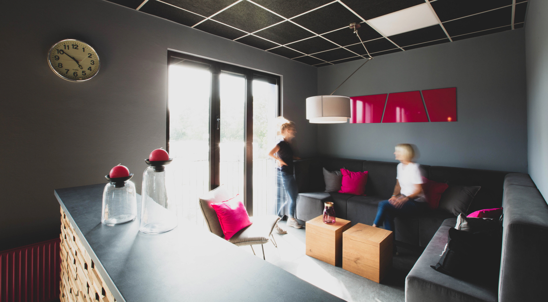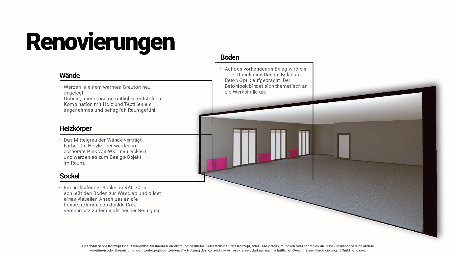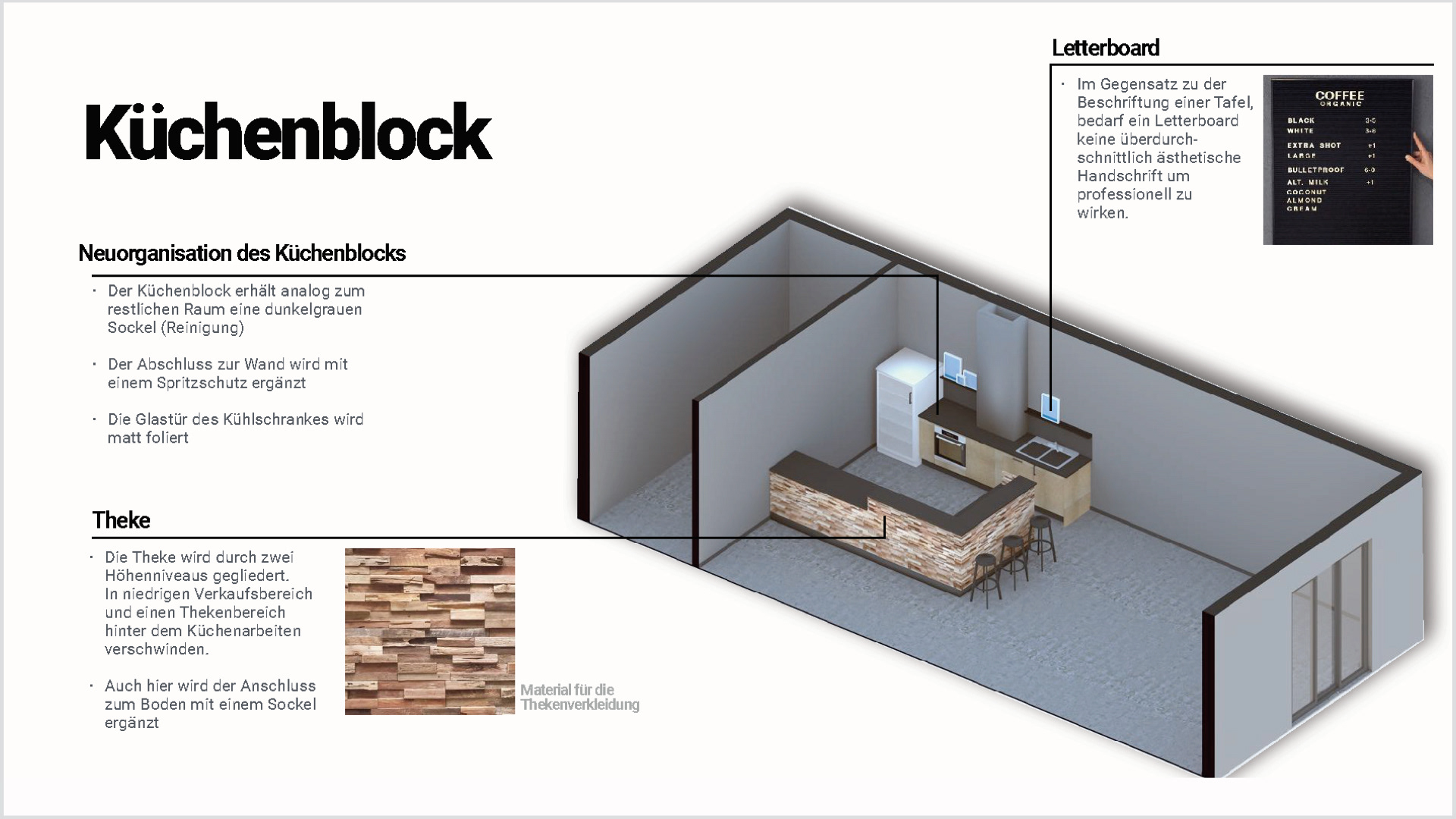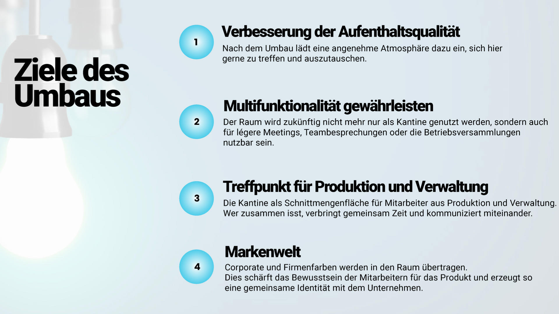 Der in die Jahre gekommene Sozialraum eines Hanauer Industriebetriebes sollte renoviert und ein zeitgemäßes und multifunktionales Interior erhalten. Zukünftig sollten hier kleine Speisen zubereitet, legere Meetings abgehalten, sowie kleine Produktpräsentationen stattfinden können. Um den betrieblichen Ablauf nicht zu stören mussten sämtliche Renovierungs- und Umbauarbeiten innerhalb von vier Werktagen durchgeführt werden.