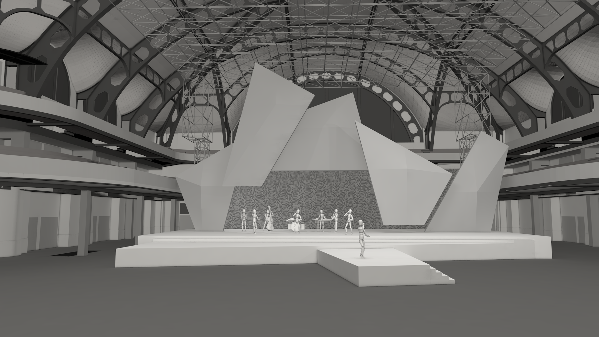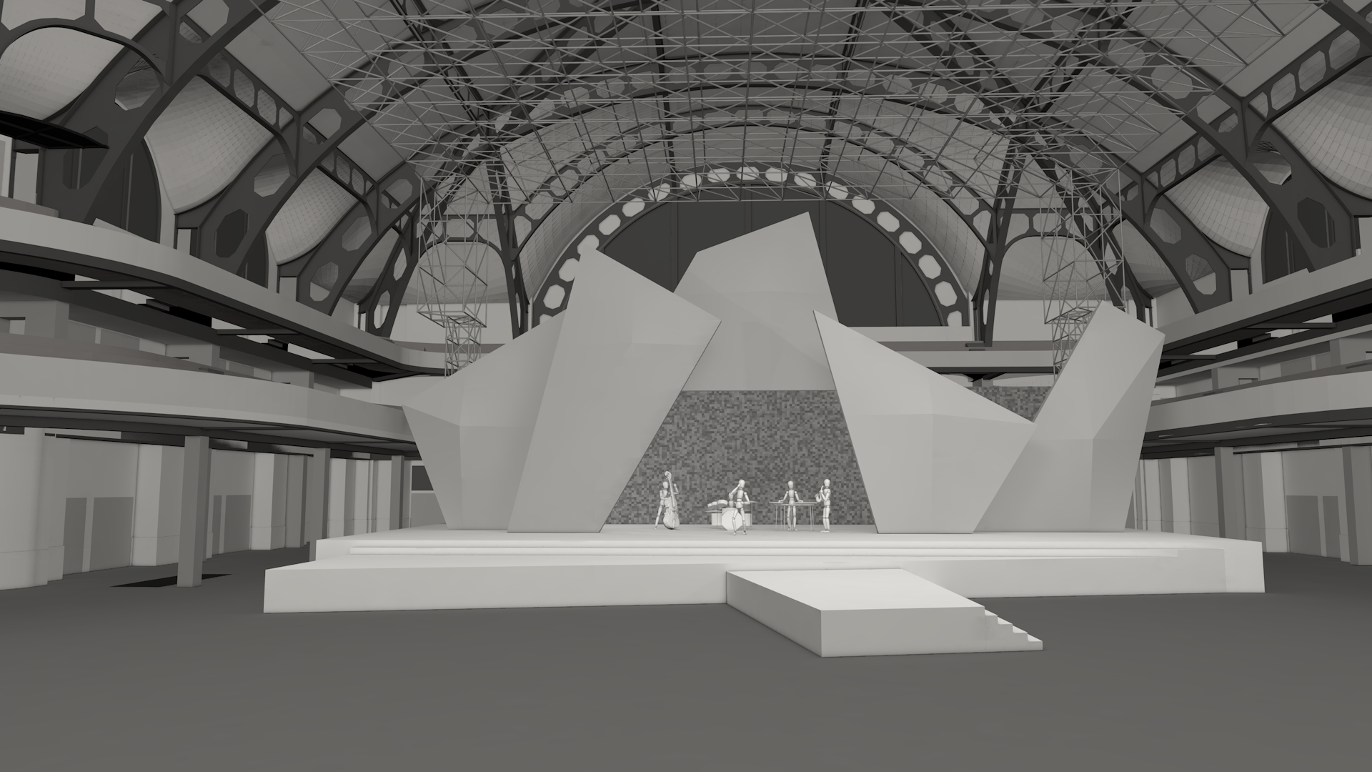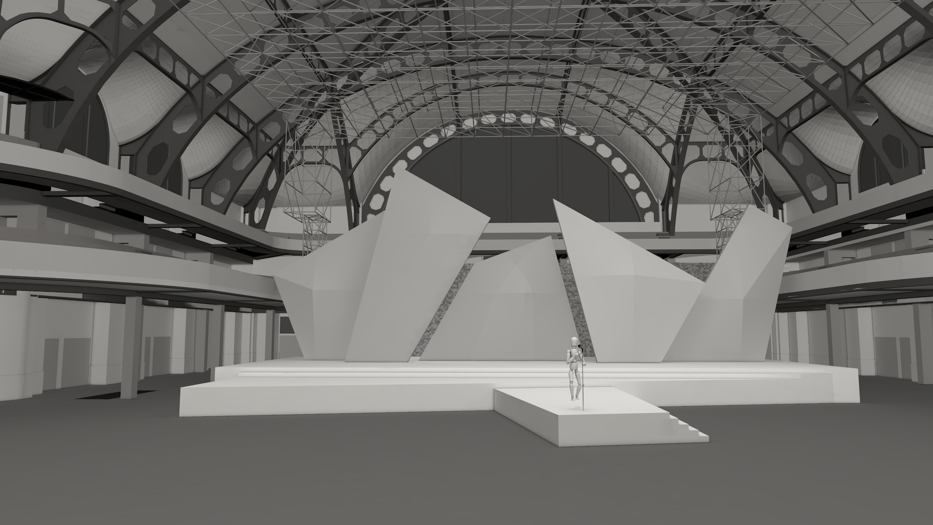 Fünf polygonale Volumenkörper bilden die Basis der Gestaltung. Diese Objekte werden fortwährend, auch im Moment der Bewegung, mit einem live Video Mapping bespielt. So entsteht, vor den Augen der Betrachter, eine dynamische Inszenierung mit immer neue Bildern und Bühnensituationen.