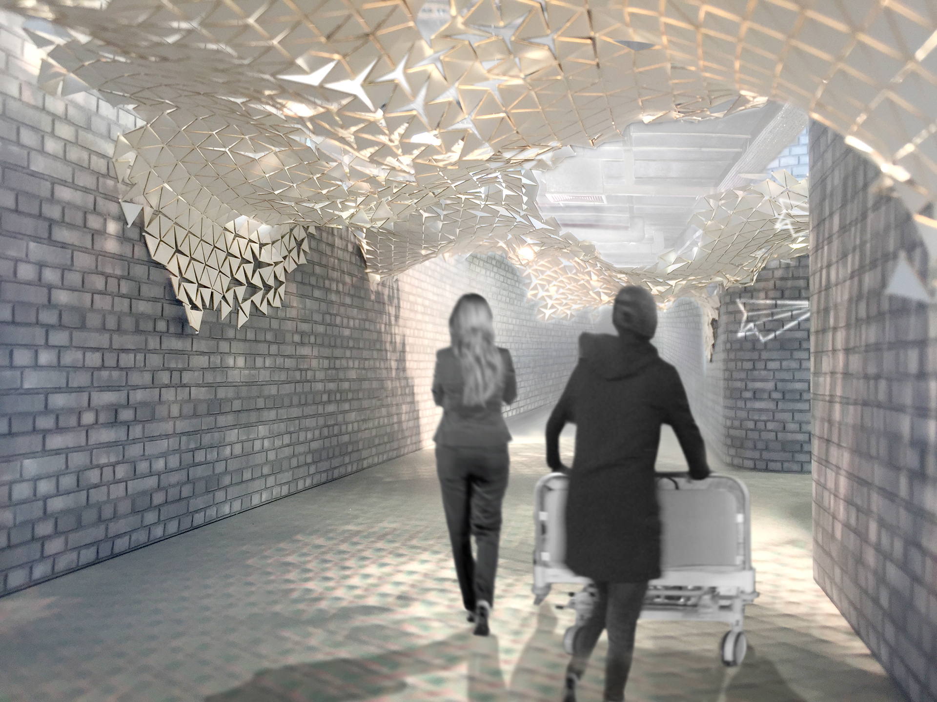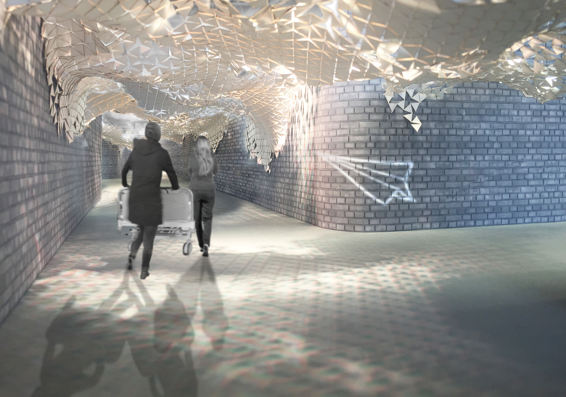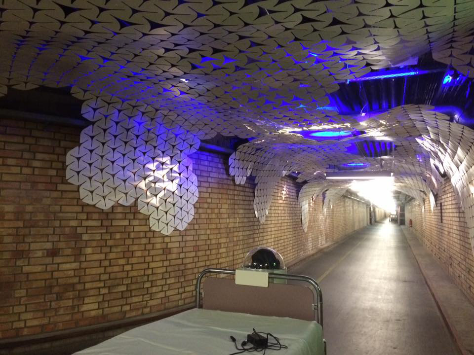 Papierplane: Begleiter für junge Patienten_Station und Operationssäle der Kinderchirurgie an der Universitätsmedizin Mainz befinden sich in zwei unterschiedlichen Gebäuden. Diese sind durch einen 200 Meter langen, funktionalen und eher roh anmutenden, unterirdischen Gang miteinander verbunden – keine optimale Atmosphäre für den Transport der jungen Patienten auf dem Weg zu ihrer Operation.